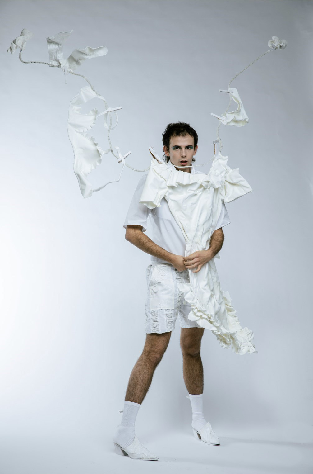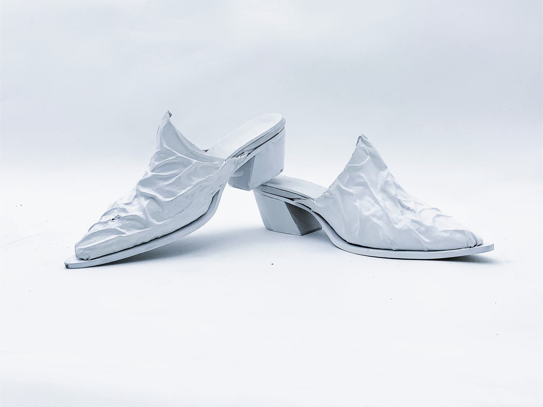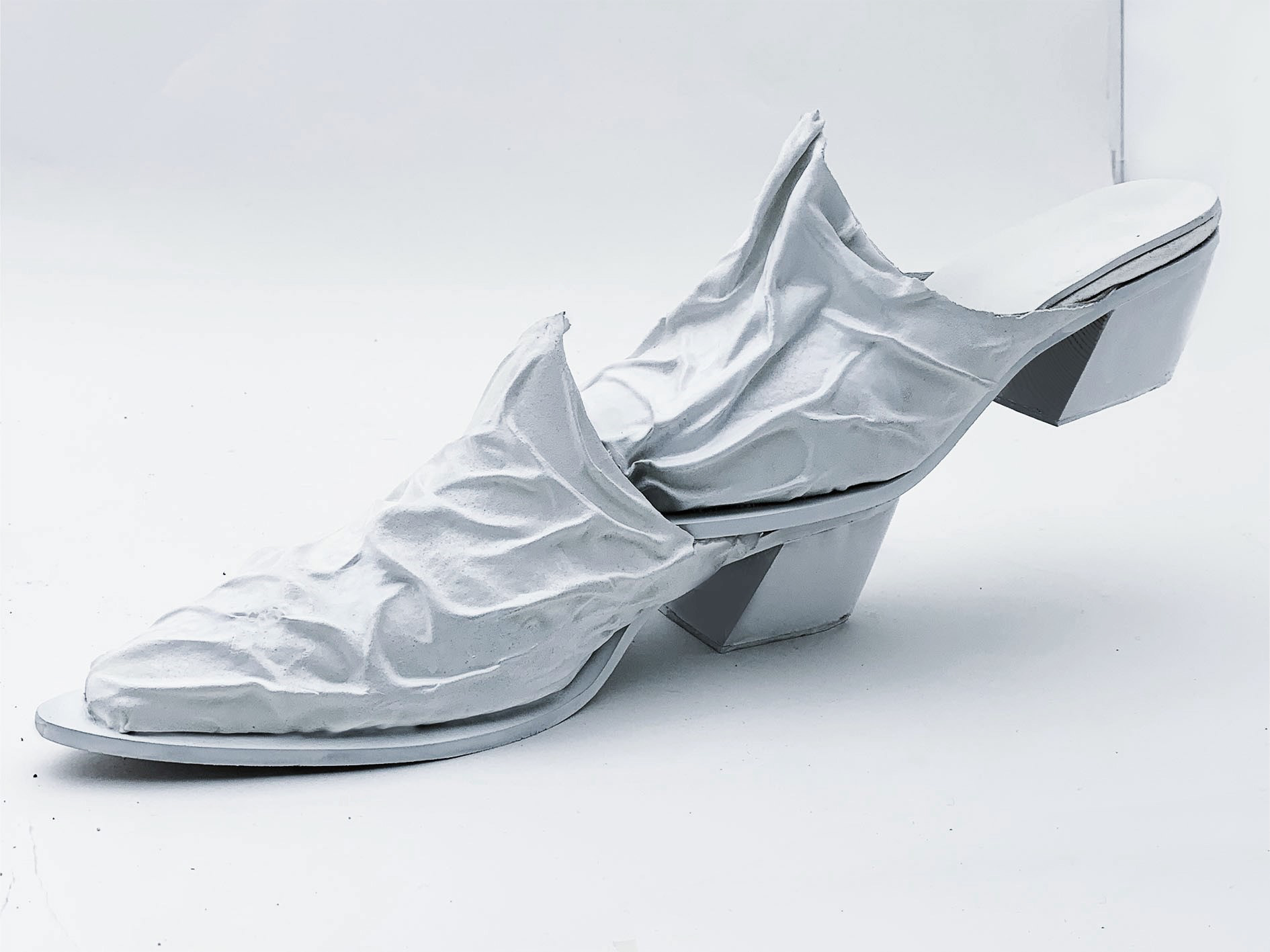 Commissioned pair for designer Dana Reyes for the Central St Martins 'White Show' in 2022. A garments collection inspired by the cost of living crisis and the return to manual chores, the task was to create a pair of white cowboy mules with the appearance of wrinkled fabric.